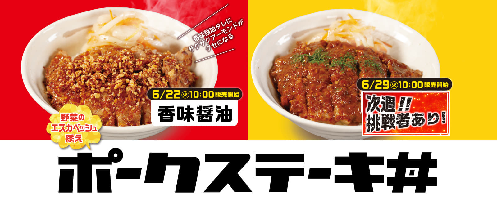 さらに、もっとお肉を楽しみたい人へお肉が2倍の「ポークステーキ丼ダブル」も発売するほか、6月29日(火)午前10時からは、豚肉の旨味を引き出す「あのソース」が新たな挑戦者として参戦。