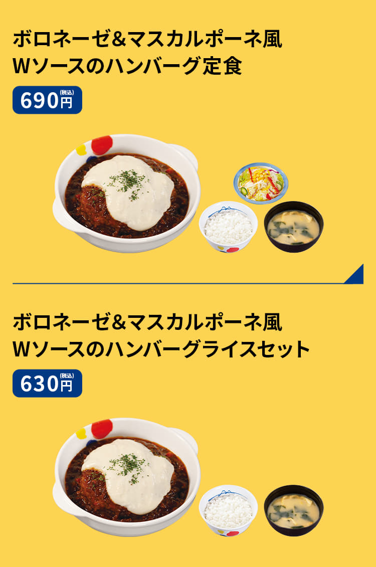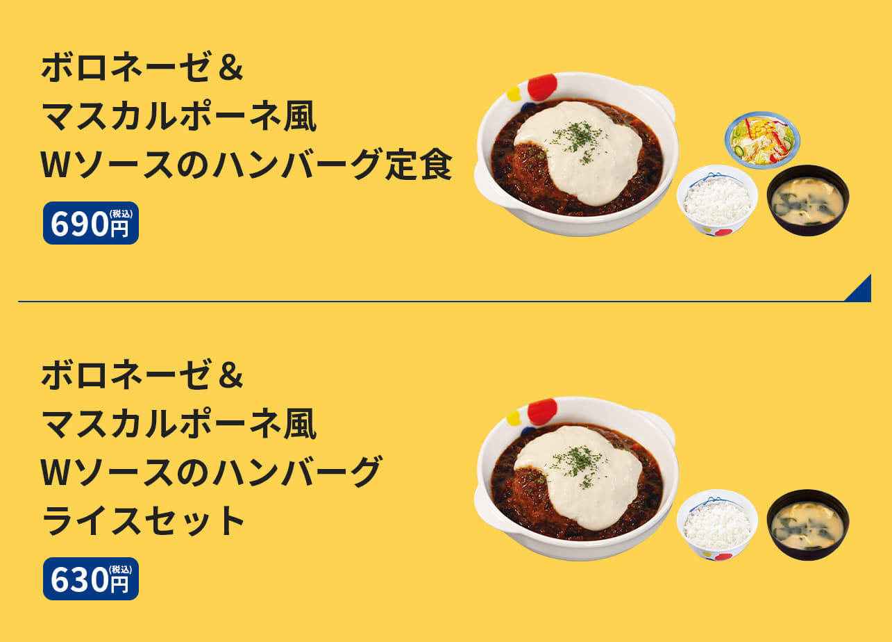 松屋にて、2021年10月5日(火)午前10時より「ボロネーゼ&マスカルポーネ風Wソースのハンバーグ定食」を販売いたします。