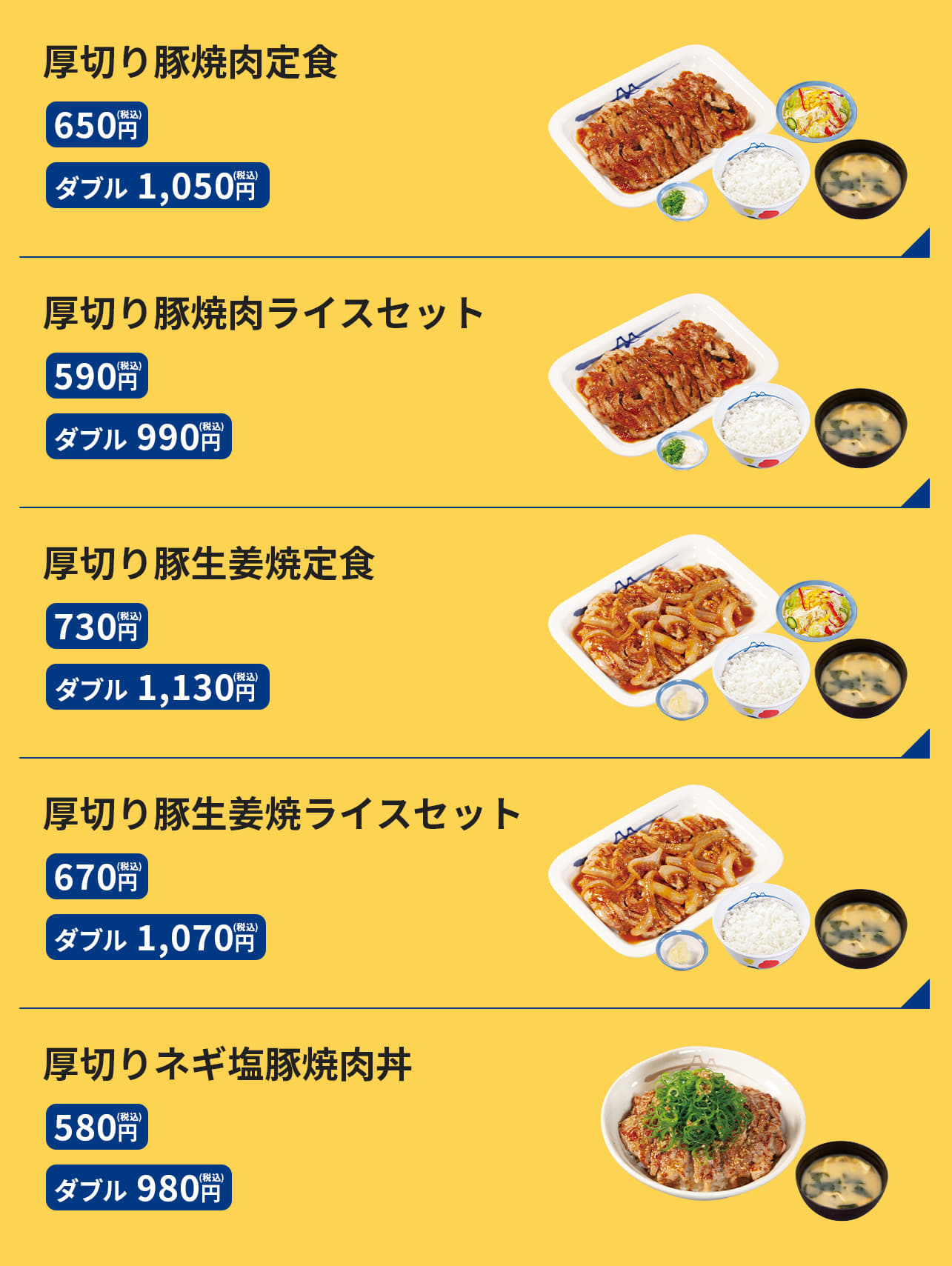 松屋定番メニューの「厚切り豚焼肉定食/ライスセット」「厚切り豚生姜焼定食/ライスセット」「厚切りネギ塩豚焼肉丼」のお肉が期間限定で25%増量します。