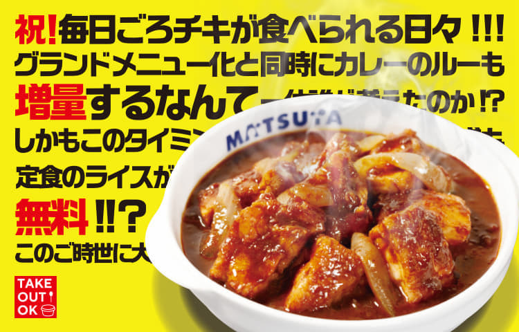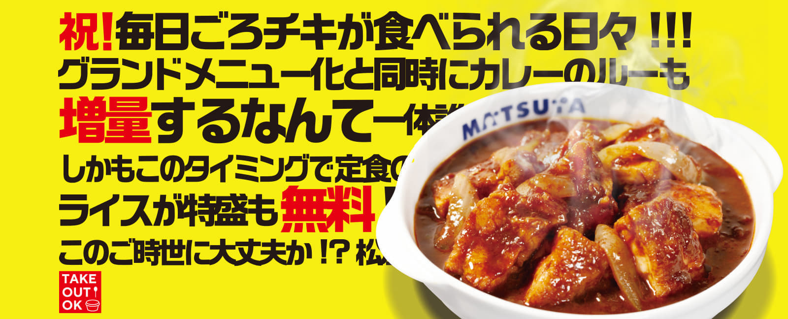 今回、オリジナルカレーソースを使ったカレーの中でも復刻販売のたびに嬉しいお声をいただく人気メニュー「ごろごろ煮込みチキンカレー」を定番メニューとして販売開始し、さらに販売時より並盛のカレーソースを増量します。