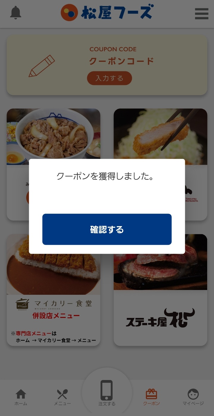 ①各種媒体に掲載されているURLを開くと、松屋アプリに遷移します。(松屋アプリ未インストールの場合はインストールしてください。)遷移後、松屋アプリにログインすると画面に「クーポンを獲得しました」と表示されます。アプリ会員ではない場合は新規会員登録をお願いします。