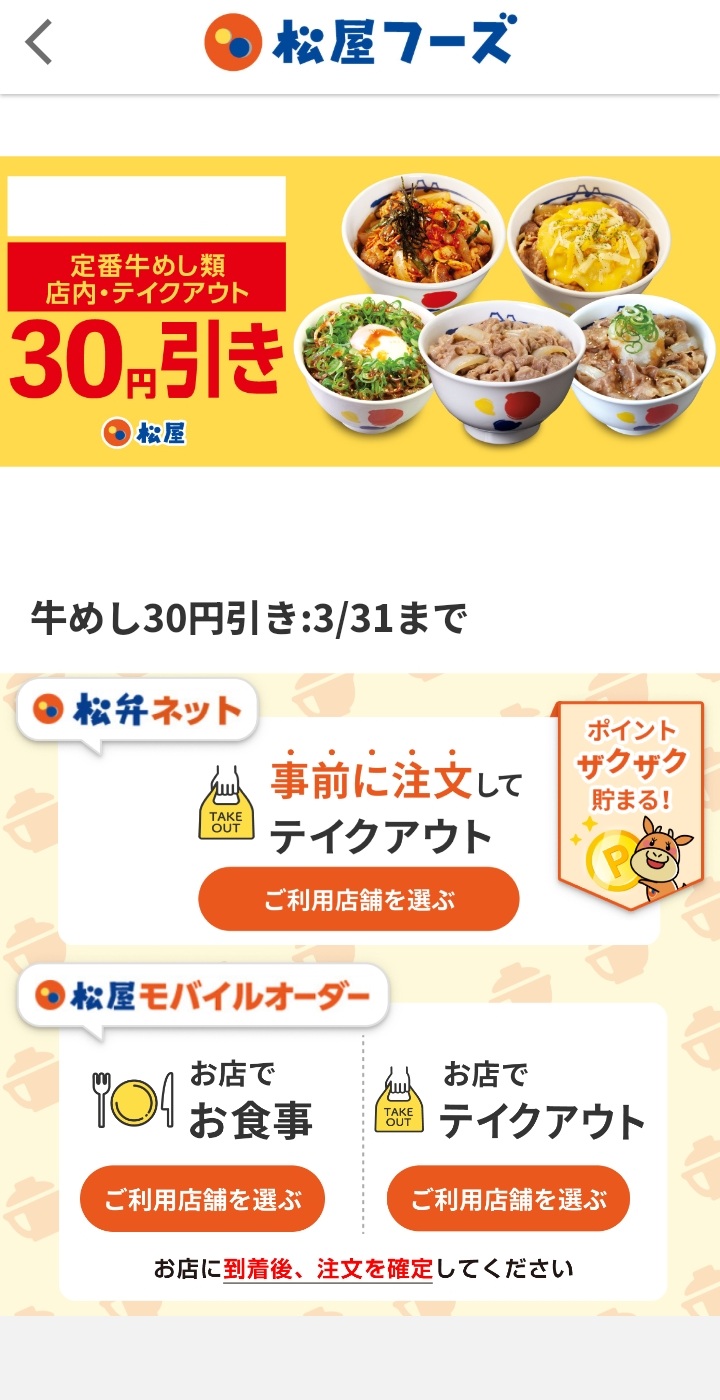 ②「確認する」を押すとクーポンページに遷移します。利用したいクーポンを選択し、「松弁ネット」「松屋モバイルオーダー」「松弁デリバリー」のいずれかを選択してください。