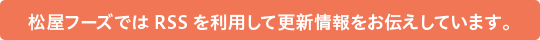 RSSを利用すれば、松屋ホームページの更新情報を、いち早く・手軽にご覧いただけます。 RSSを使って更新情報を受け取るには、RSS対応ブラウザーなどのRSSリーダーに、下記のRSSフィードを登録してください。