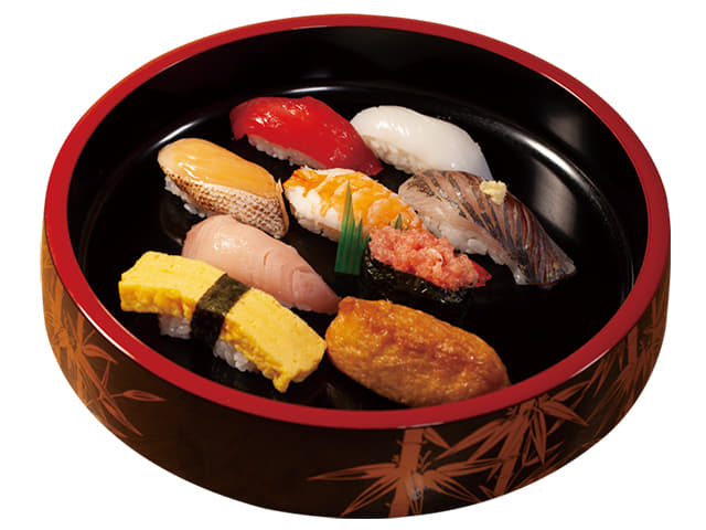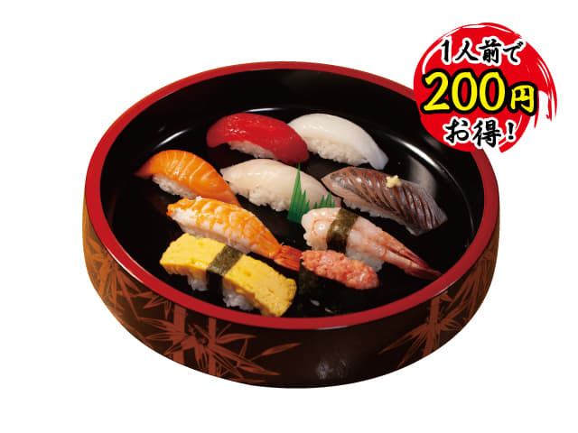 まぐろ3貫・活〆真鯛3貫・エビ3貫・生サーモン6貫、焼サーモン3貫・いくら軍艦3貫・玉子3貫・ネギトロ巻2本 店頭前日予約割引対象外